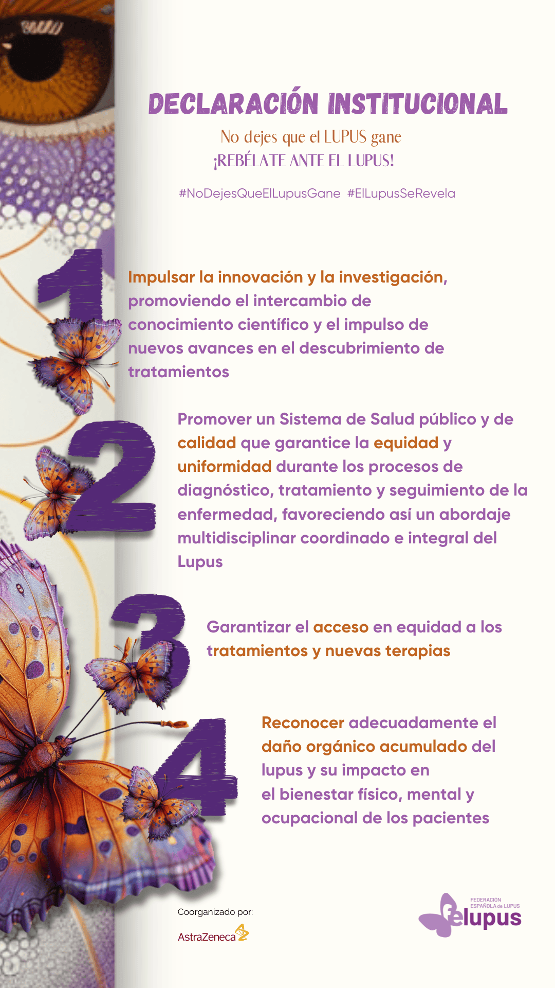 Con motivo del Día Mundial del Lupus, 10 de Mayo, bajo el lema “No dejes que el lupus gane: rebélate ante el lupus”, FELUPUS busca alentar a los pacientes que no deben rendirse frente al lupus e insta a las Administraciones y Entidades en general a actuar juntos, manifestando su reconocimiento y apoyo a las personas que conviven con esta enfermedad, y declarando su compromiso para contribuir a dar respuesta a las necesidades no cubiertas en España.