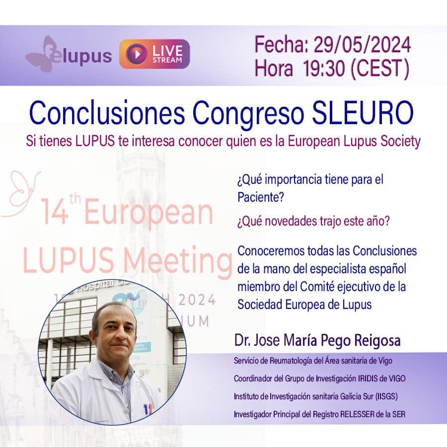 Las fechas han estado bailando hasta que ayer se pudo cerrar. Apúntate esta fecha en tu agenda, mañana tienes una cita importante Instagram Live 29 de mayo de 2024 a las 19:30 con el Dr. José María Pego Reigosa, único representante español en el Comité ejecutivo de la Sociedad Europea de Lupus (SLEURO) nos hablará: