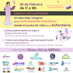 El 20 de febrero arrancamos nuestra temporada con los Webinar para pacientes y el primero que vamos a hacer este año con la SER es desde el punto de vista de la Enfermería, ya que creemos que juegan un gran papel en el abordaje de las enfermedades reumáticas y que tienen información valiosa que ofrecer y de gran utilidad.
